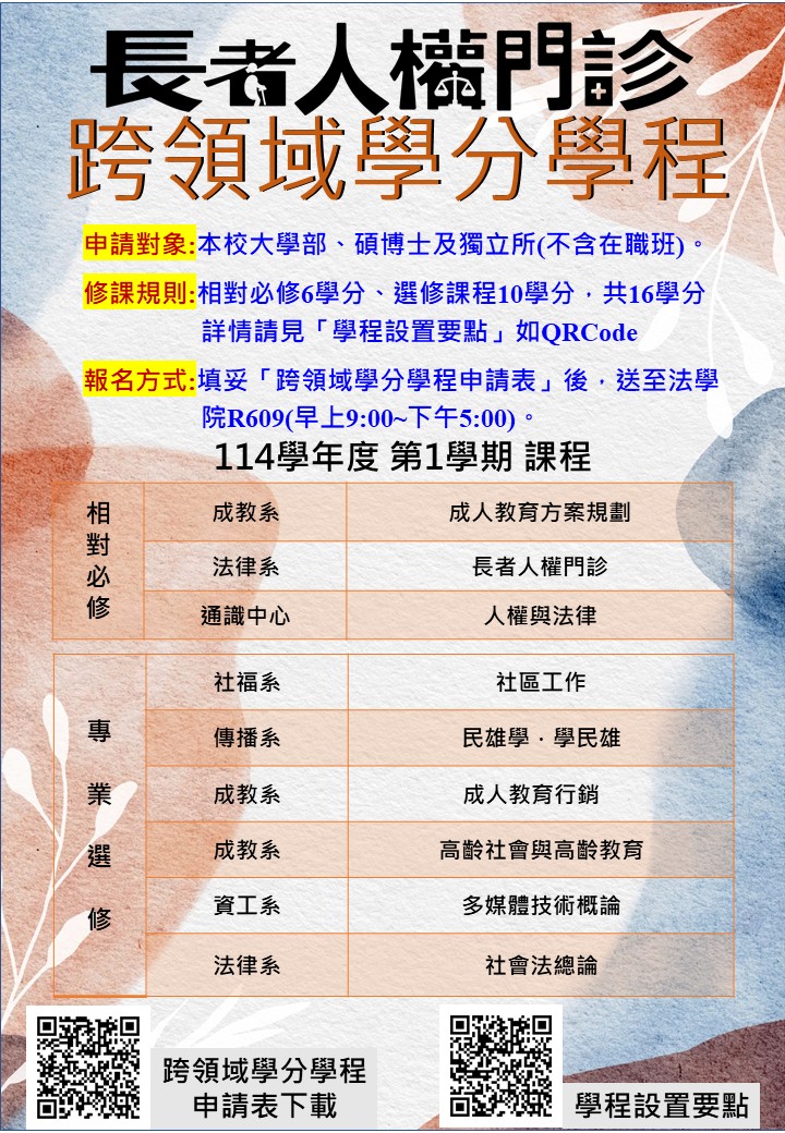 (一)本校在學學生(含學士班或碩、博士班學生),對於未來老人化社會和長者人權事務有興趣者皆得申請修習本學程。本學程採登記制,學生可下載「長者人權門診跨域學分學程申請書」,填寫後繳交至法學院登錄備查。